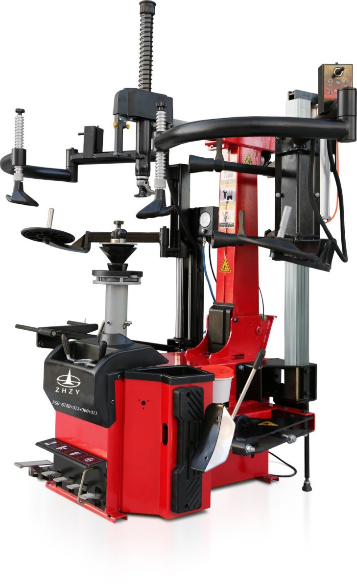 本品为自动后倾式扁平轮胎拆装机,配有自动摆臂式助力装置,气动锁紧装置。